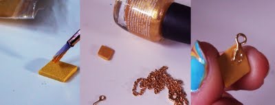 Step 4: carefully brush the top of your diamond with the gold eyeshadow. Make sure you get it all into the textured parts, making sure you get a good shine all around. You can press down a little hard to make sure the shadow adheres. Now, bake the piece (I used a toaster oven set at 150 degrees for 15 minutes). If you are using a regular oven, I usually do about 215 degrees at 20 minutes. Let it cool completely. (Get out some gold nail polish, you will need it next!) When that’s cool, superglue your loop to the back of the charm as above. Make sure none of the straight part pokes out above the tip.