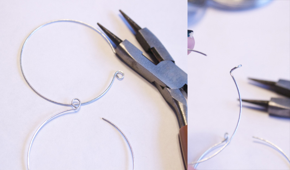 Step 2: Cut two equal lengths of wire; I cut these straight from the coil so that they were round and equal length. You can use any length, depending on how large you want your earring. Mine were about 2.5″ across. Make two loops with your pliers, one at the end of each earring. Twist the loop so that the open part faces the straight end of the wire.