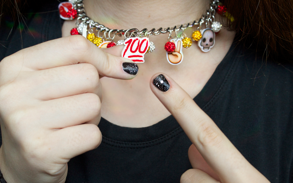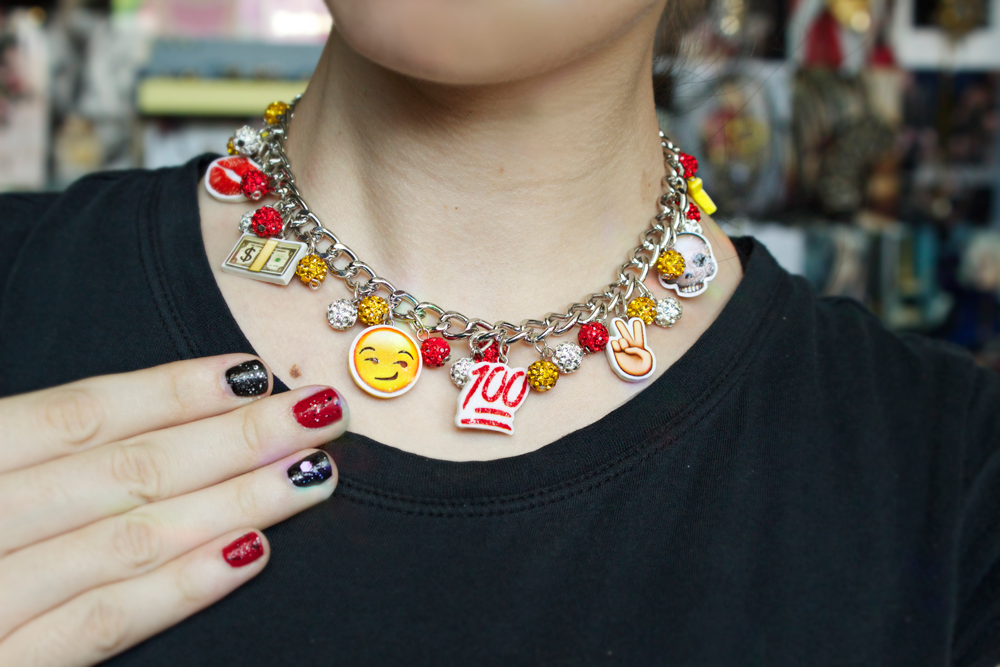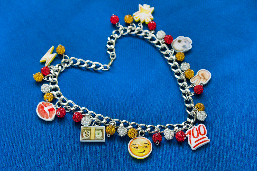 Adding these emoji charms to chunky chain from Cousin Corporation, and mixing with rhinestone pave beads, totally completes the look. It’s a little over-the-top, but totally on purpose.