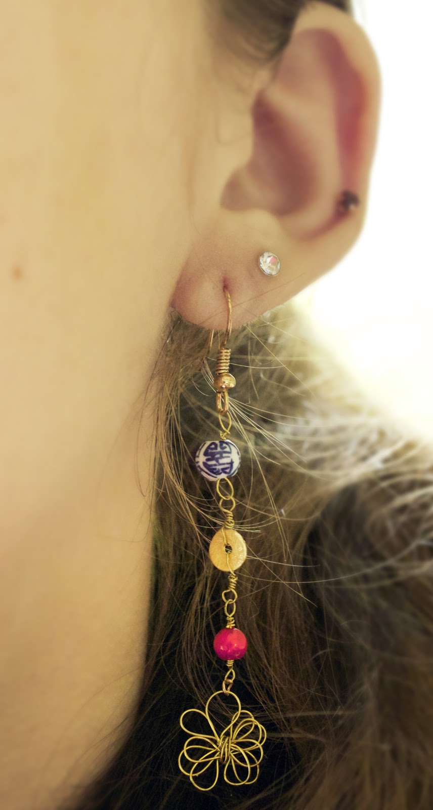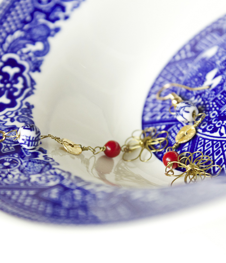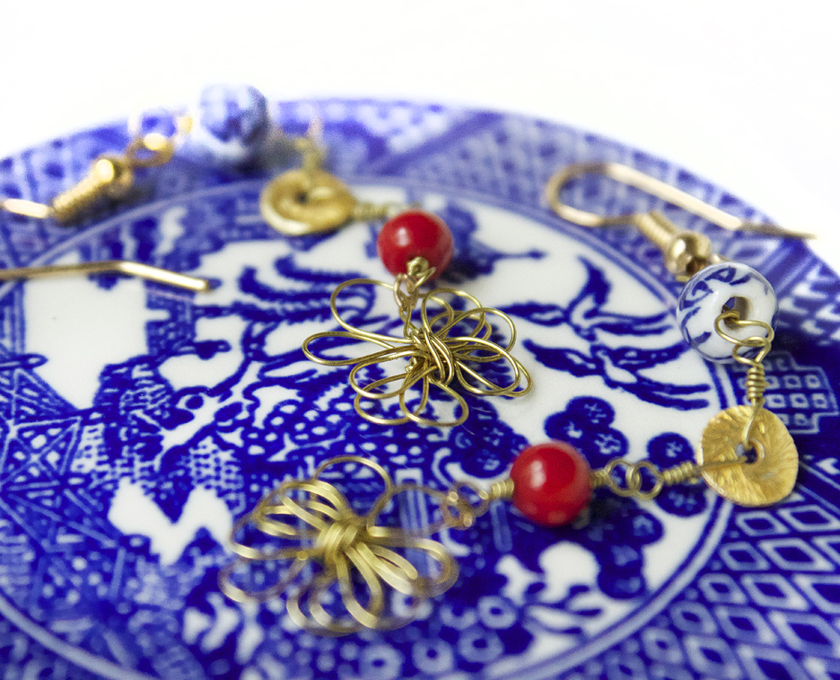 Here is the more wearable version, in earring form. These earrings are super lightweight and also are very dainty. I took heed to to the abstracted flowers and made a wire flower as the focal point. I then used red, a color from the collection, and added some gold accents with the beads and wire.
