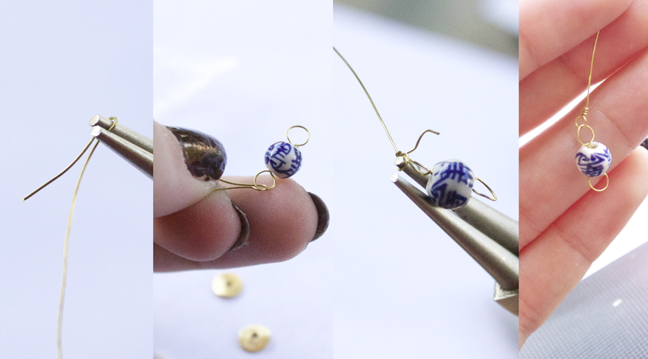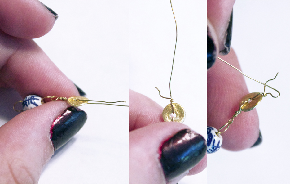 Step 5: Thread your disc bead through the wire, and bend the wire back up, wrapping it right next to the beginning to close. The disc should be lying flat, instead of sticking out horizontally.