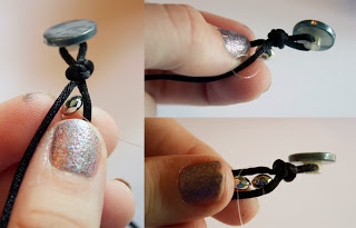 Step 4: Repeat the tecnhique all the way until your bracelet is the desired length, I made mine 2.5′. When it is the desired length (make sure it wraps at least 3 times around your wrist), simply tie all 3 cords together in a tight knot. I tied the monofilament into a small knot again so it wouldn’t slip through the bigger knot, then I added a bit of glue to secure. I then cut the monofilament after this knot. Leave about a half inch or so (enough for your button to snugly fit through) and tie another overhand knot with the two black cords. Cut excess string off.