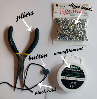 Step 1: Gather materials. Needed are pliers and scissors, 6mm acrylic silver rondelles (from Cousin), black cord (from Cousin)-also called “rat-tail cord”, clear monofilament (from Cousin) and a silver button (for closing).