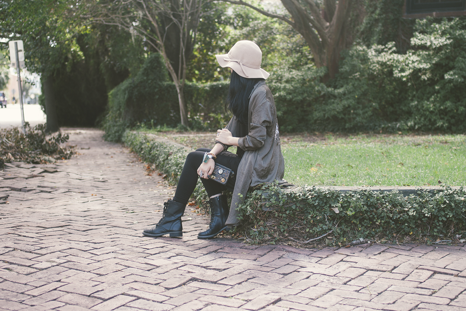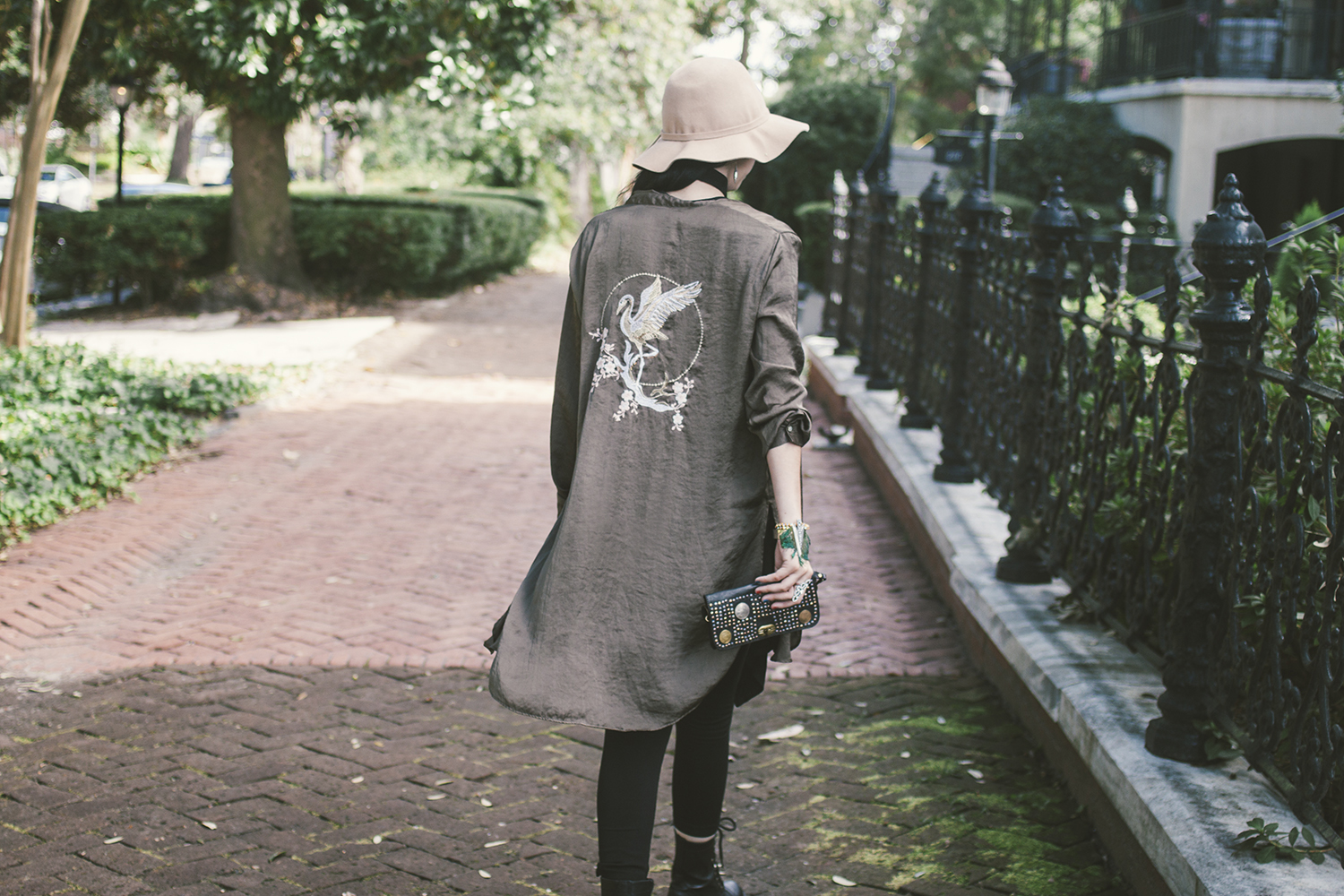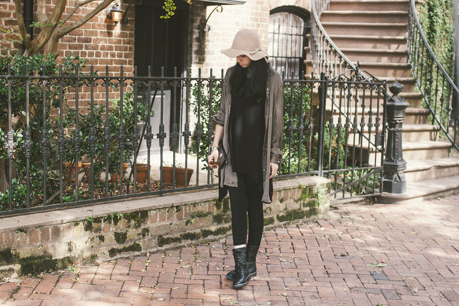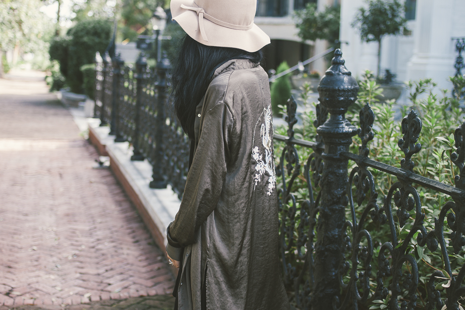 The olive greens of Savannah, Georgia perfectly complimented my pre-planned outfit. Black is always the answer, but this time, is matched with a super silky Zara jacket and tawny floppy hat.