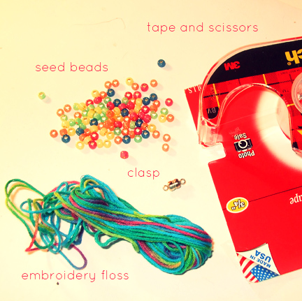Step 1: Gather materials. Needed are seed beads (size 8 or larger), Cotton Embroidery Floss, tape and scissors. Also, either a magnetic clasp or a large bead (mine was about 6mm) and two crimps are needed for closure.
