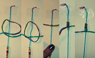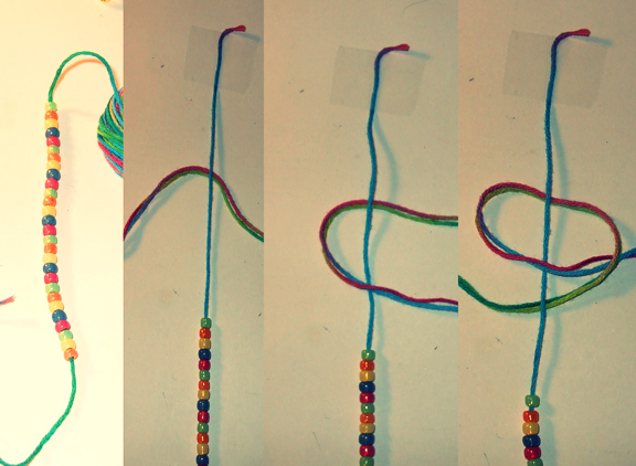Step 2: String on your beads. Cut a piece of floss about 1.5 times the length that you will need your bracelet to be. String on enough beads to go around your wrist (I used 20, but I have small wrists). Tie a knot at the very bottom of the floss, and tape the top down to a flat surface.