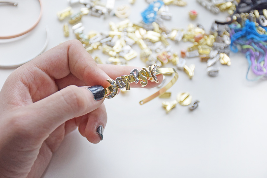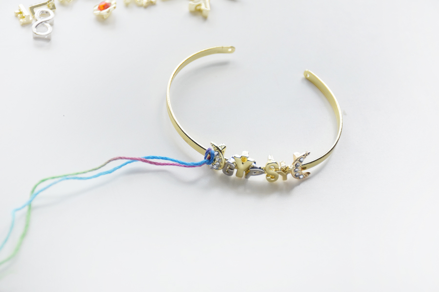 Step 1: Gather materials. You will need embroidery floss, rhinestone alphabet sliders (or any kind of alphabet slider bead — mix metals for a bohemian feel!), plain skinny bangle bracelets and super glue.