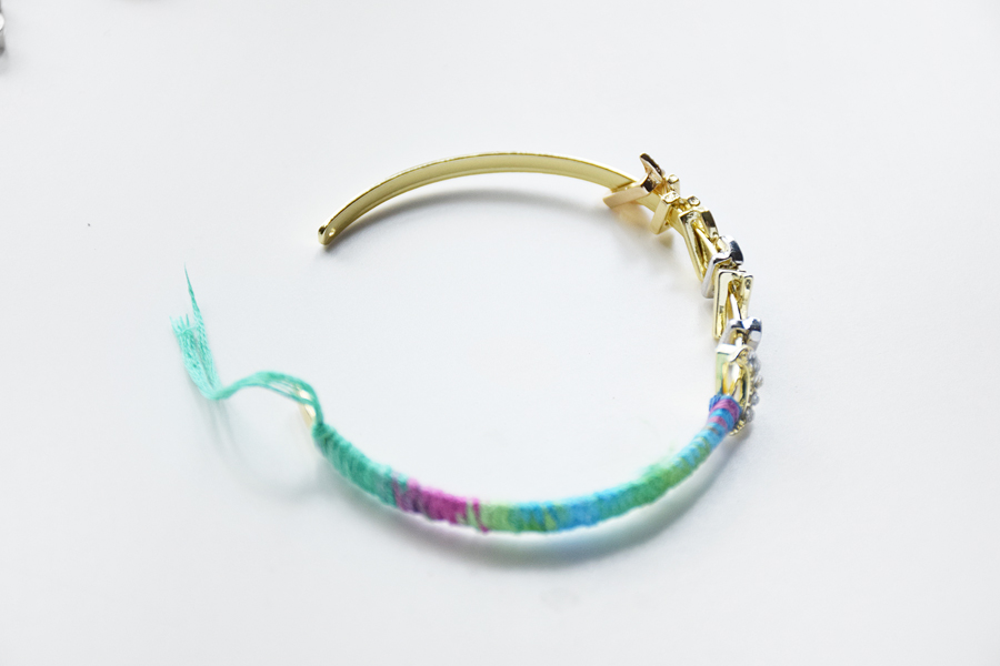 Secure with another knot, and superglue in place. Wrap the other side of the bangle in the same manner.