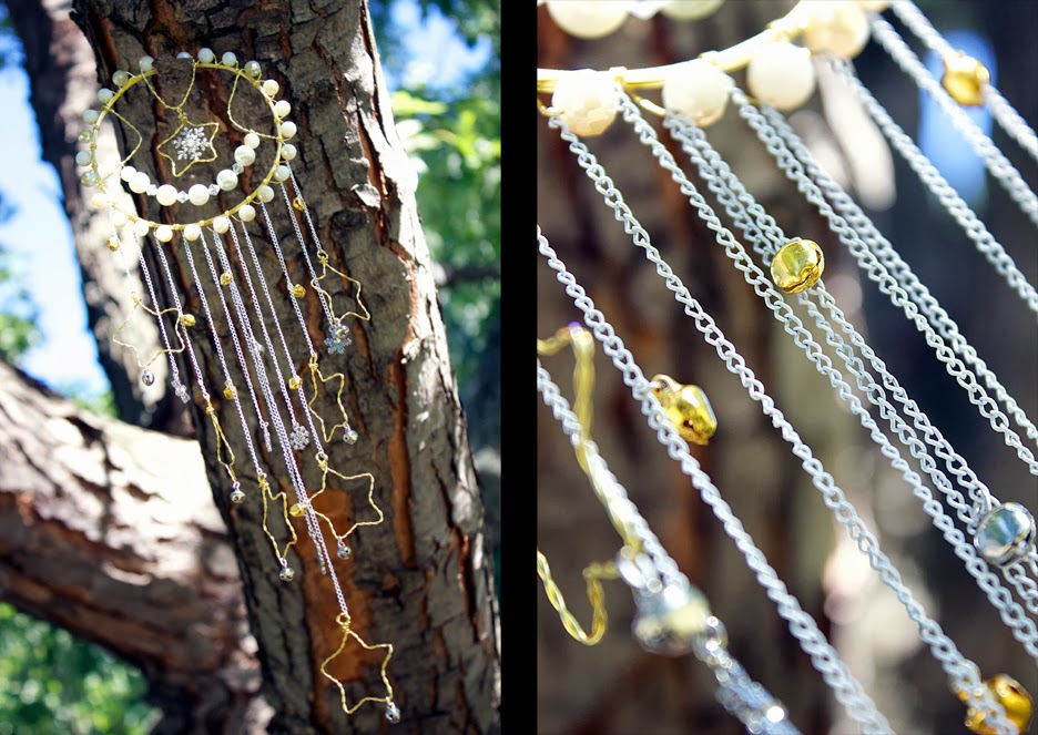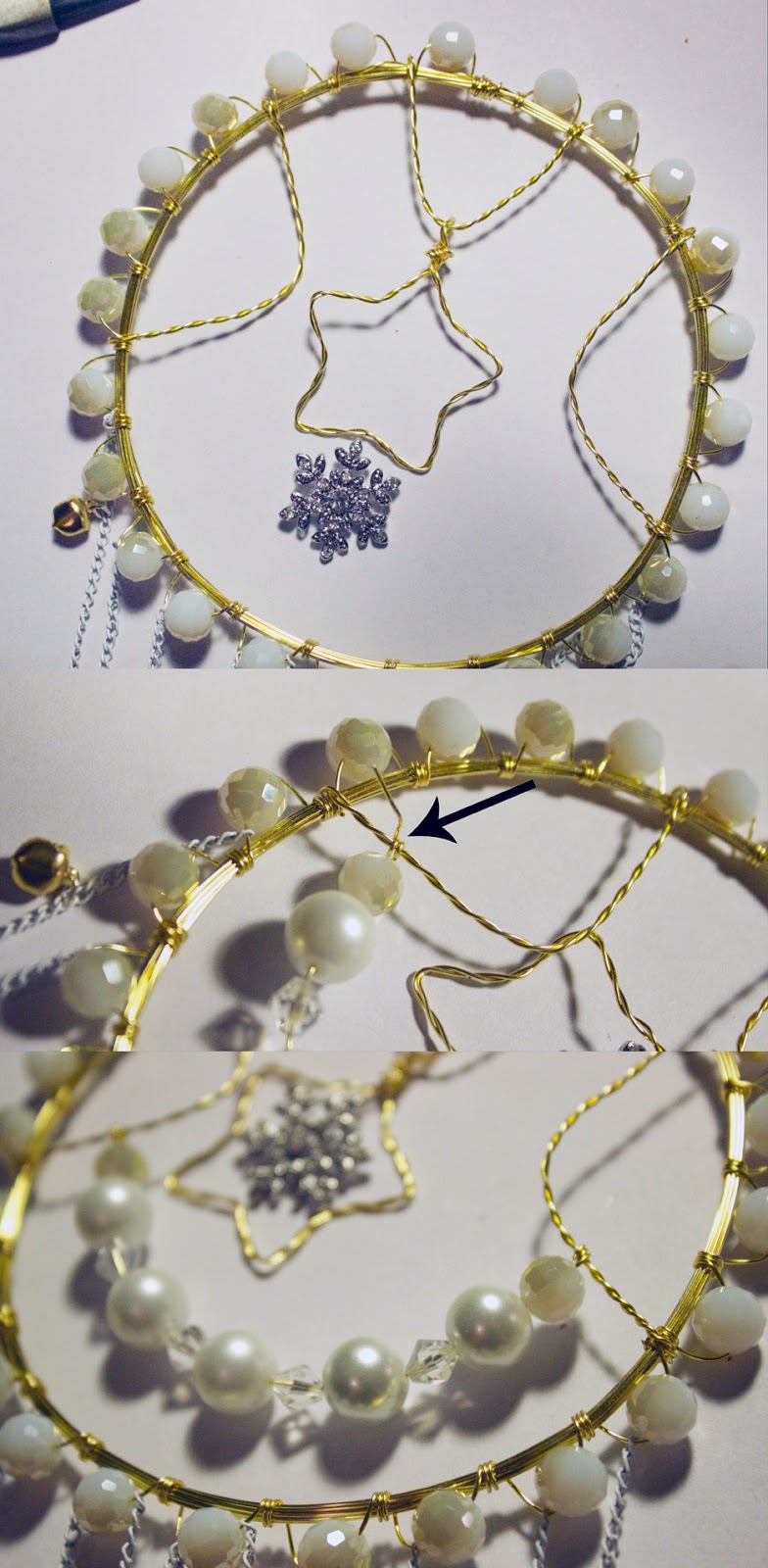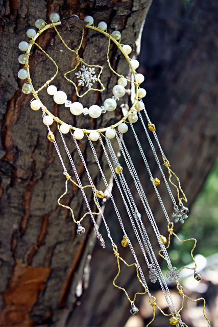 Attach them in this pattern; 8″ star in the middle, followed by the 7″ piece. Like a mirror, add the 5″ snowflake piece on either side of the middle, then the 5.5″ stars, then the 4.5″ stars, then the 3.5″ snowflakes, then finally the 2.5″ stars. Attach all these with your jumprings to the wire loops you made when wire wrapping (in between each bead, not connecting them to the thick frame itself. It should look like this above.