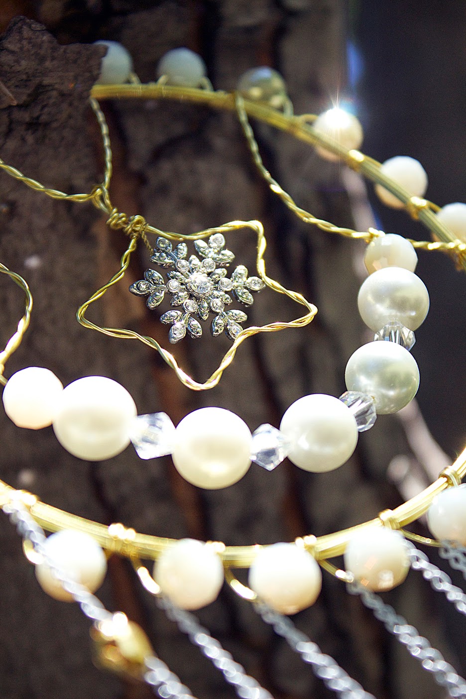 Step 9: Repeat Step 8, and add this piece to the other side (shown in first picture). Make one more piece, but only using 3″ of wire, thread on your last star charm, and attach to the top as shown. Add your snowflake charm to the middle of this star charm with a jump ring. Lastly, cut about 6″ of wire, and bead on alternating white pearls and 4mm clear crystals (I used 5 pearls and 4 crystals). Wrap this around your leftmost twisted wire decoration (second picture), then wrap around your other side to finish (last picture). You are finished!