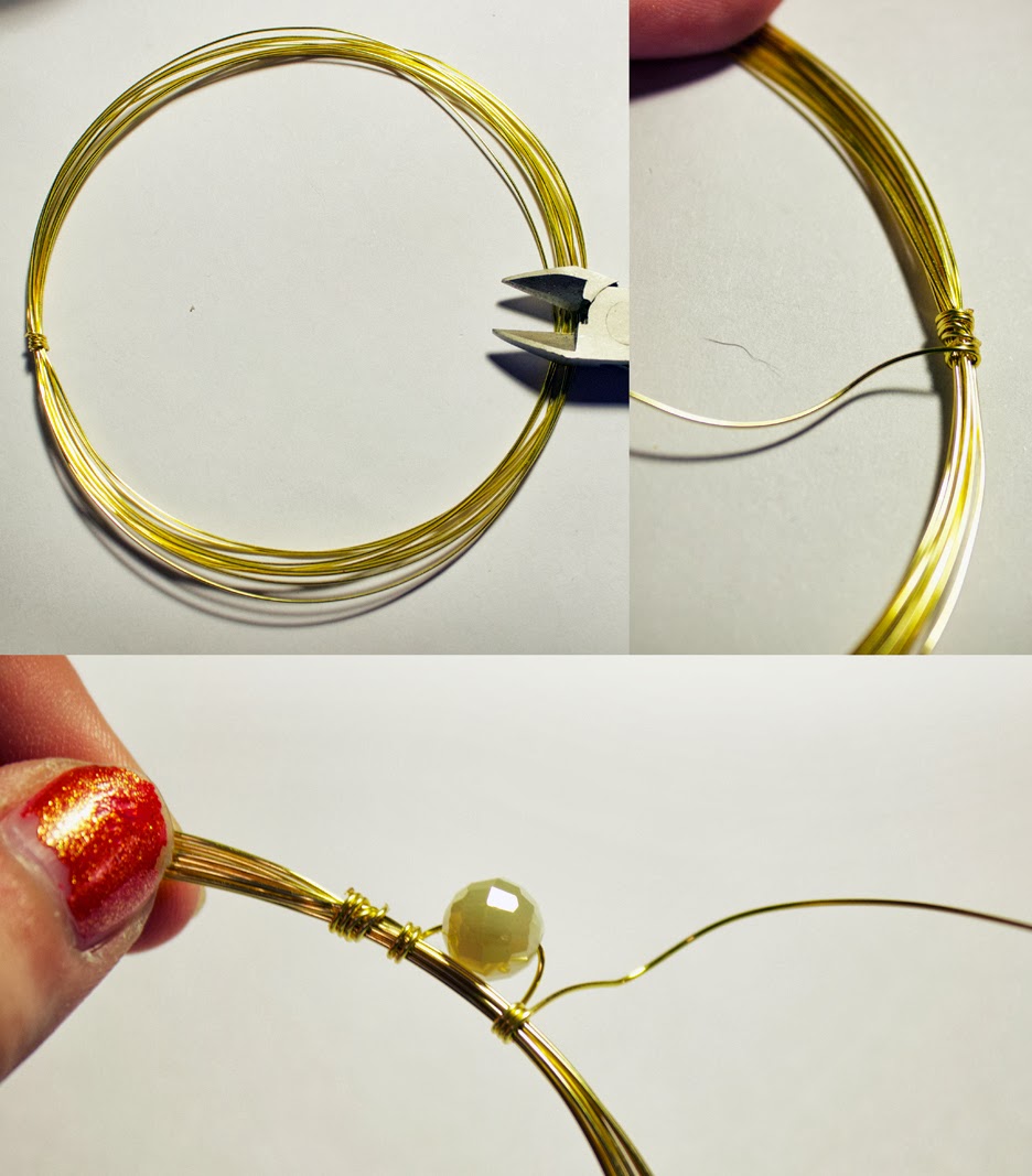 Step 3: With your gold wire, wrap about 10 times around a biscuit cutter or glass to create a large frame for your dreamcatcher. Where both ends meet, take a 3″ piece of wire and wrap around these ends to secure, then cut the wire flush.