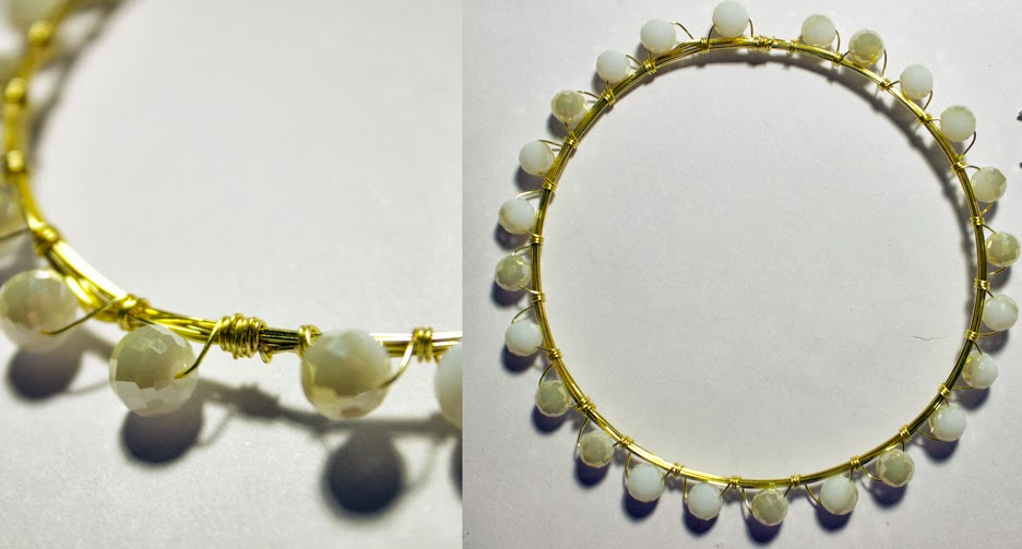 Step 5: Continue wrapping, until you have finished the whole frame. Your amount of beads and amount of wire will vary depending on what size you want your dreamcatcher. Mine is about 4.5″ in diameter. Cut the wire flush when you finish wrapping.