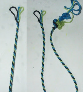 Step 3: Now, take all of the threads together, and twist them to the right; a spiral should form and hold tight. You can stop twisting when the bracelet holds itself in the pattern.