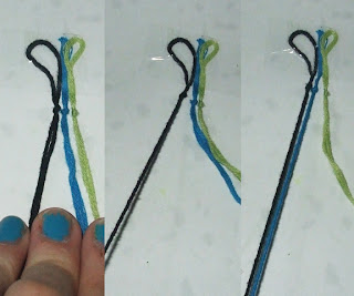 Step 2: Cut about 4 times the length you want your final bracelet to be; fold this piece in half. Repeat with 2 other colors. Tie overhand knots about 1″ from the end. Tape these three flosses together on your table. Take the leftmost color; twist this thread towards the left, really tight (but not too tight that it bunches up). Repeat with the center color, and the right color. You may need to either hold the ends in your teeth or tape down to keep the twist tight while twisting the other threads!