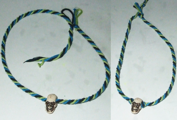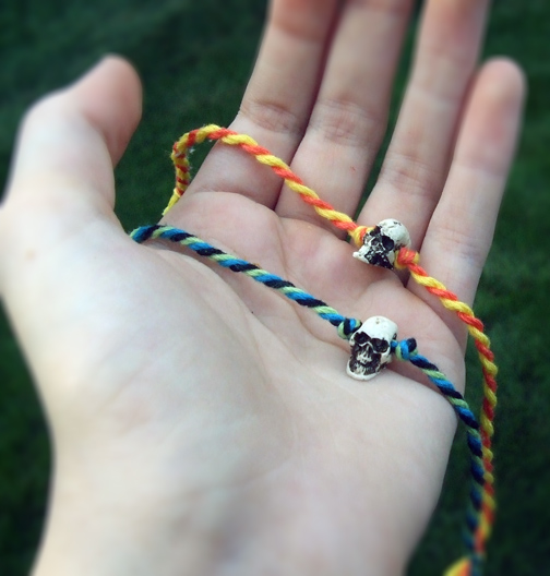 Step 4: Add your skull bead to the middle and knot. Knot the ends as well and cut.