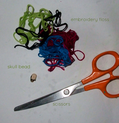 Step 1: Gather materials. Needed are scissors, embroidery floss, and a skull bead. You will also need tape.