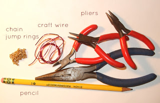 Step 1: Gather materials. Needed are pliers, plain craft wire (nothing special here!), a necklace chain and jump rings, a pencil, paper.