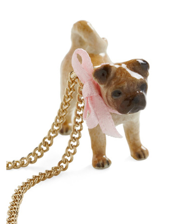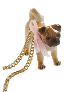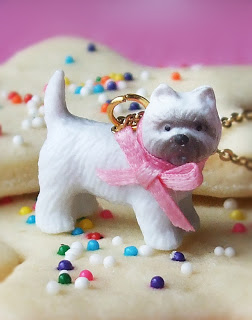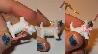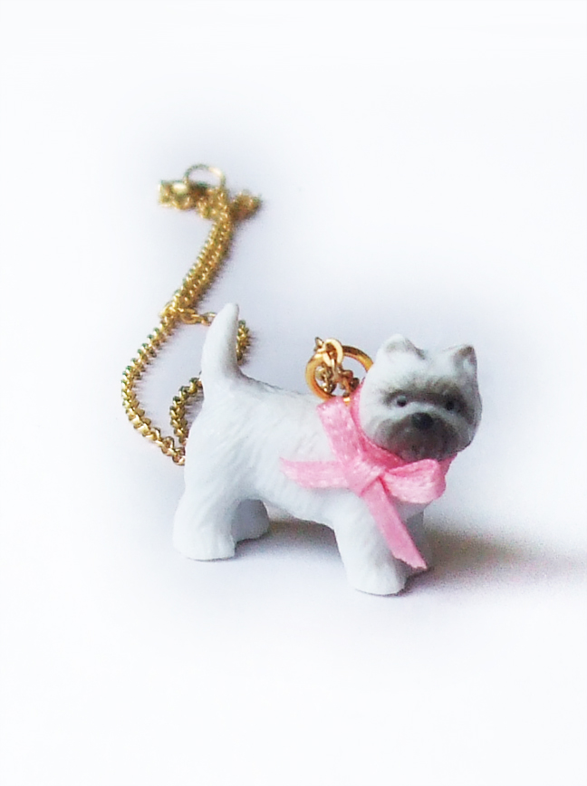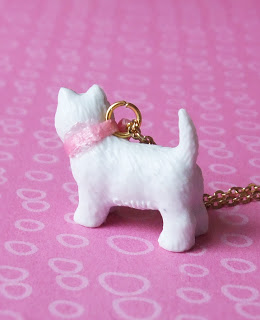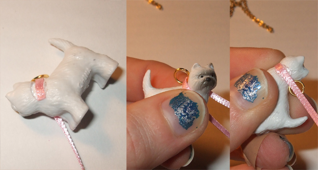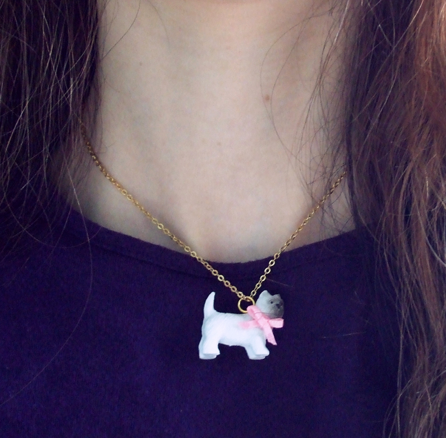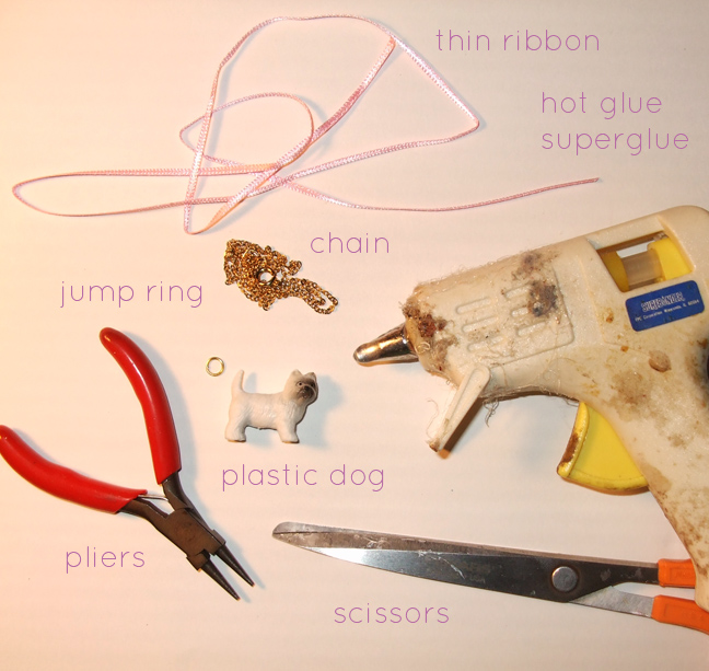 I used a small plastic dog (like for dollhouses, or even maybe a kid's toy) and a scrap of ribbon I had laying around. The real necklace is porcelain; so if you drop it, you are kind of out of luck! My plastic version solves that. Also, on the necklace's website, many people had complaints about the bow unraveling, thus ruining their necklace. For my version, I used both superglue and hot glue (which seems to literally melt the plastic underneath and form a super-tough hold) to prevent this problem. Also, I sealed the ribbon with clear nail polish. No unraveling!