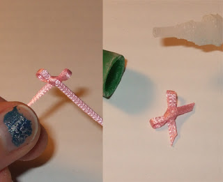 Step 2: Make the small bow. tie a bow in the center of your ribbon scrap. If you need help making a perfect bow, follow my tutorial here. Once done, drench the back of the knot with superglue, making sure to get around all sides to prevent unraveling. Paint the ends of the ribbon with clear nail polish to prevent fraying as well.