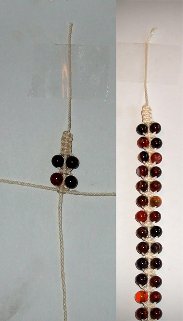Make a square knot, making sure the beads are caught in the knot and lie right on either side of the center thread. Tie one more square knot to hold the beads in place tightly.
