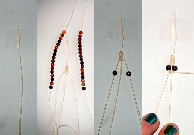 Now, you will do a square knot with the beads on the outside (instead of the inside like in the Square Knot Bracelet Tutorial).