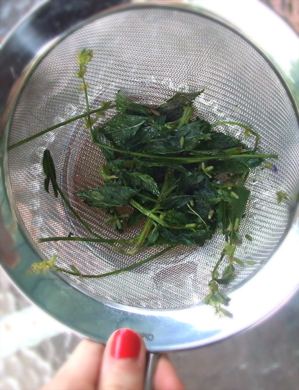 Step 4: After this has had time to infuse, strain it through a fine mesh sieve into a measuring cup. Make sure to press down and squeeze the herbs to get all the lingering juice out!