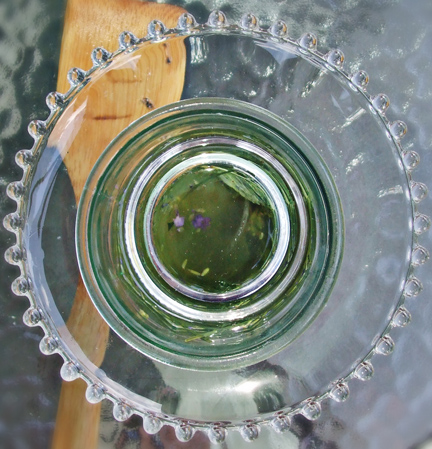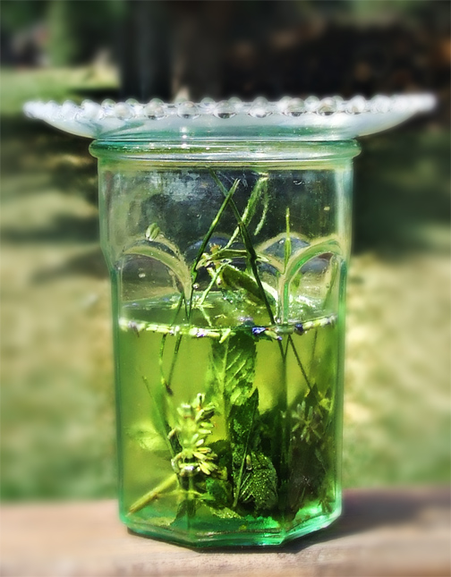 Now, set this glass aside in the sun (maybe on a patio table), cover with a dish o for a couple of hours to really infuse this water with the essential oils and nutrients from the herbs.