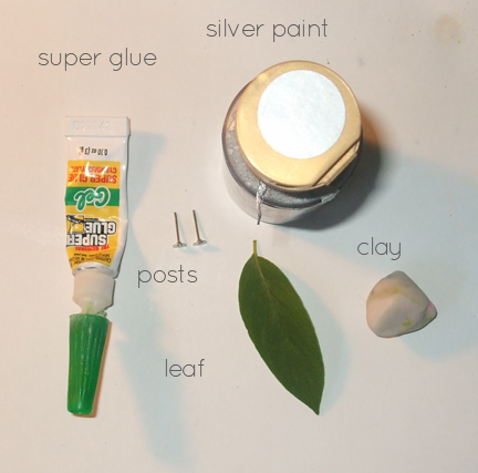 Step 1: Gather materials. Needed are two earring posts, clay, a leaf, silver clay and super glue.