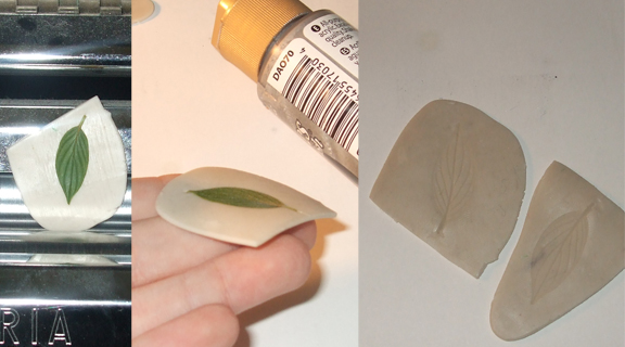 Step 2: Make the leaves. Take a marble of clay, and flatten through the thickest setting on a pasta machine. Place your leaf on top, and run it through the machine about 2 clicks thinner. It should be pressed into the clay like this. Gently peel off leaf. Repeat for second earring.