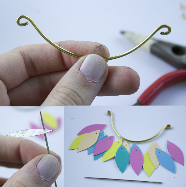 Step 3: Take your wire, cut about 4". Loop one end with pliers, bend into a U shape, and loop the other side. Depending on how big you want your pendant, and how many petals you want, you can cut less or more of the wire. Poke holes through the top of the paint chips. Quickly coat the chips with a thin layer of gloss, for shine and protection.