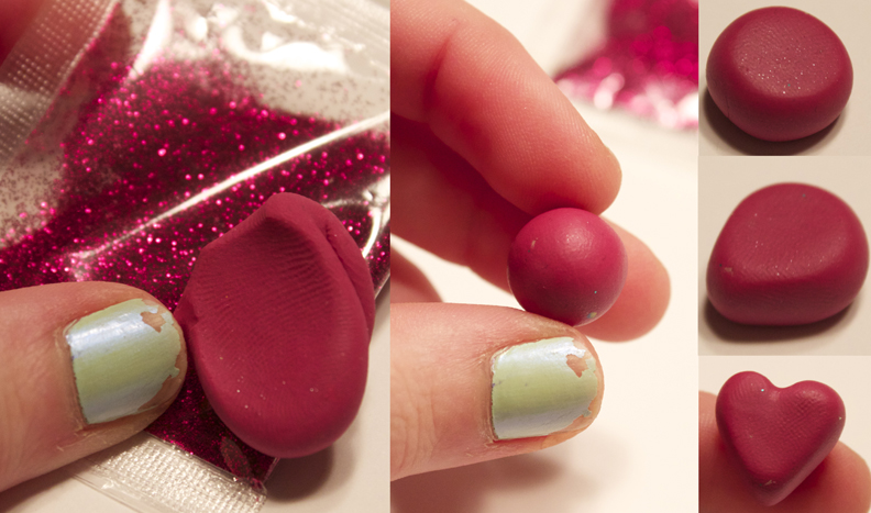 Step 3: Take your marble of clay, and shape it into a little heart. It helps to flatten out the marble, then take a toothpick and press it right in the top, to create the two rounded pieces at top. Push your headpin right through the center.