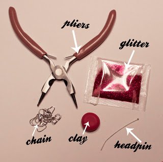 Step 1: Gather materials. Needed are pliers, glitter, clay, a headpin and a chain.