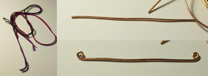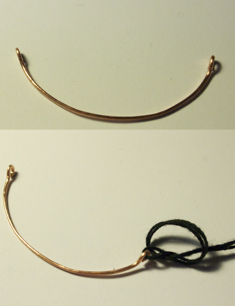 Step 4: Take one of your floss pieces, and thread it through the loop 'till the folded part: tie a knot here to secure the thread onto the wire. Repeat with the other side.