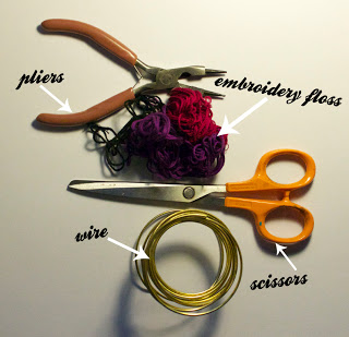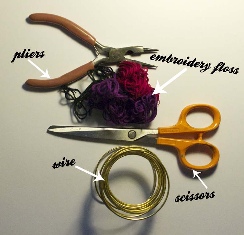 Step 1: Gather materials. All that's needed are scissors, pliers, embroidery floss, and thick wire (maybe like 16 or 18 gauge, just make sure it is thick and doesn't bend that easily). Beads too if you want to