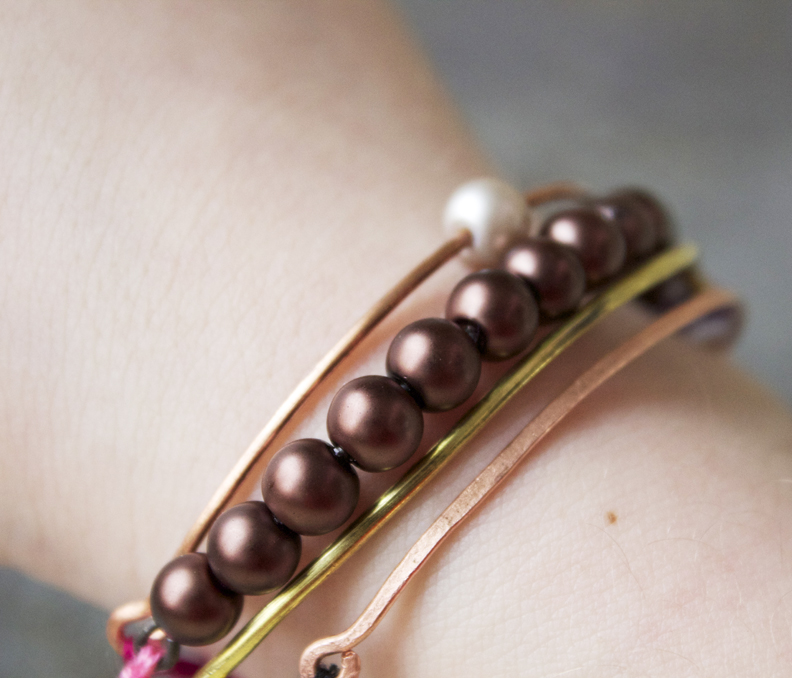 The pearls I used are from Prima Beads. Great selection of beads, findings, other goodies and free shipping! Mixing pearls with the metal and the floss creates a cool mix of textures. Great for layering for the summer. They are delicate and mix well because of the simplicity of the bracelets.