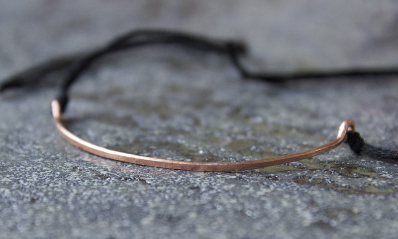 Step 3: I went outside and gently hammered my wire piece like in the Perched Harmonies necklace. Go easy with it, not totally flat, just enough to give it some texture. You don't have to hammer it, you can keep it plain, or mix and match hammered bangles with regular wire ones to mix the texture. After hammering, bend it around a glass or bottle to give it an arched shape.