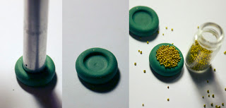 Now, once your clay is baked and cooled, put a small dollop of your glue in the indentation; pour your microbeads over to cover the glue, press in gently.