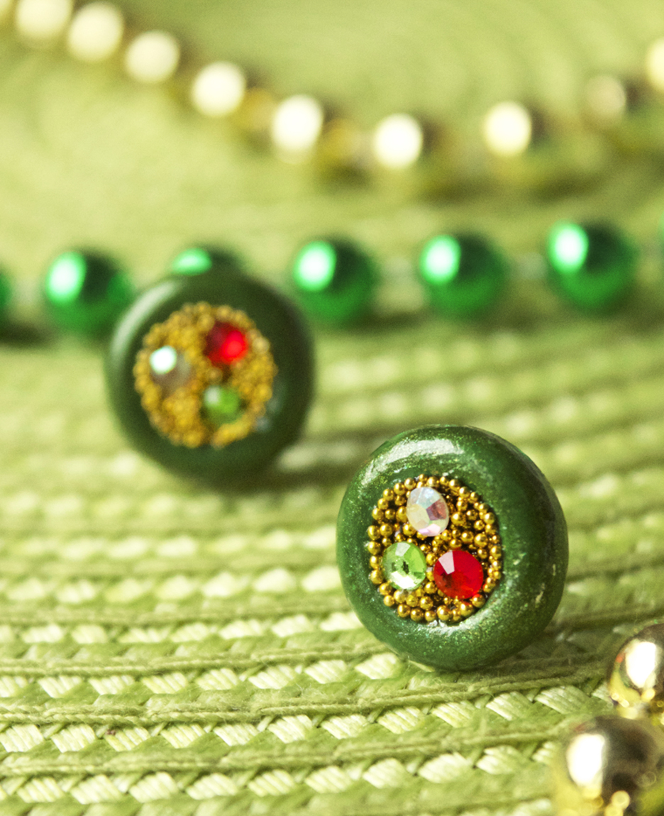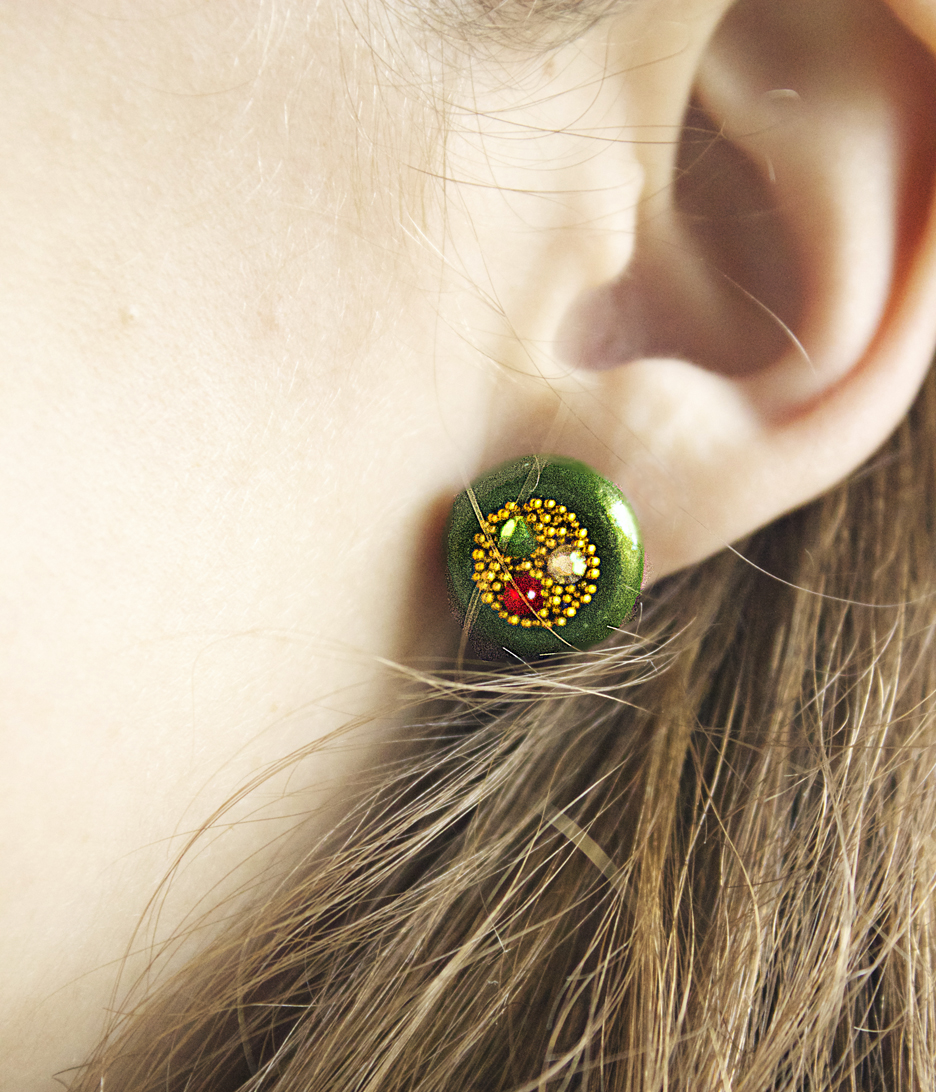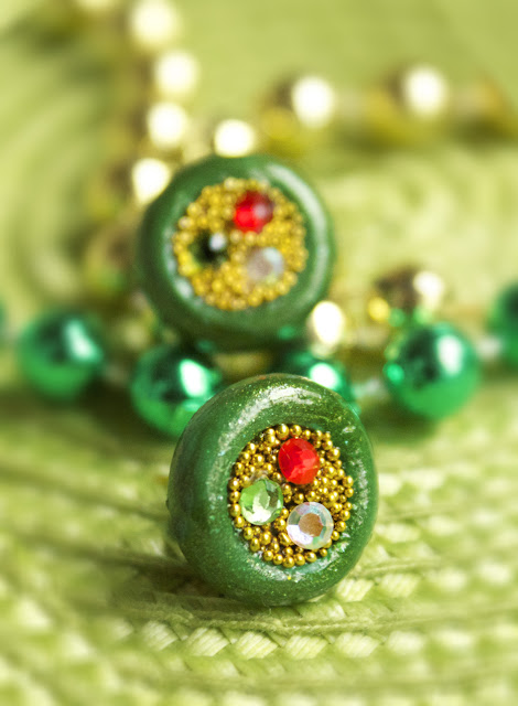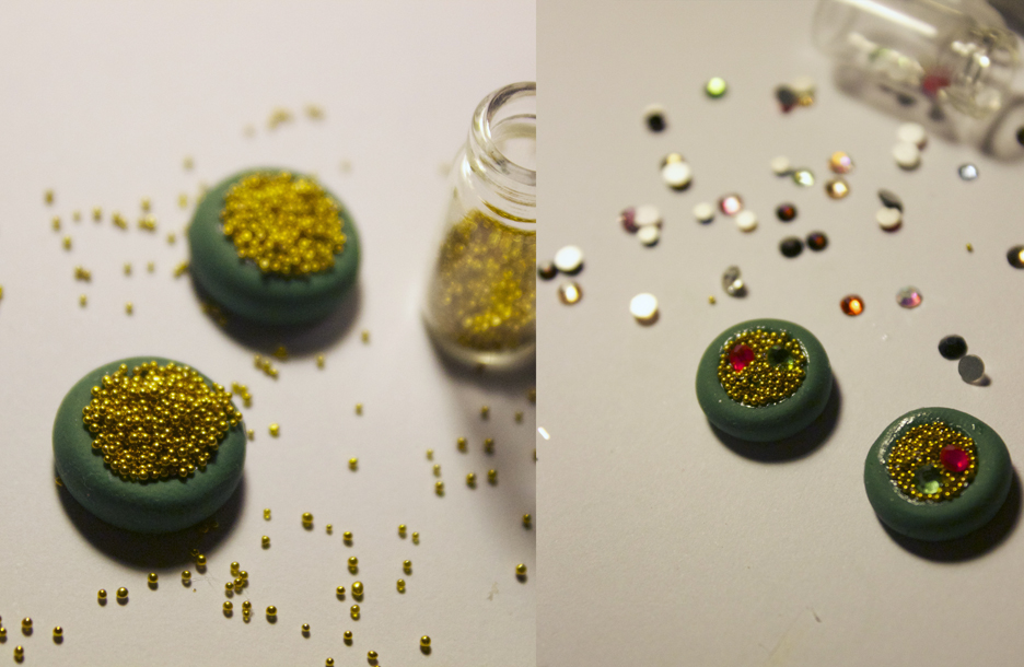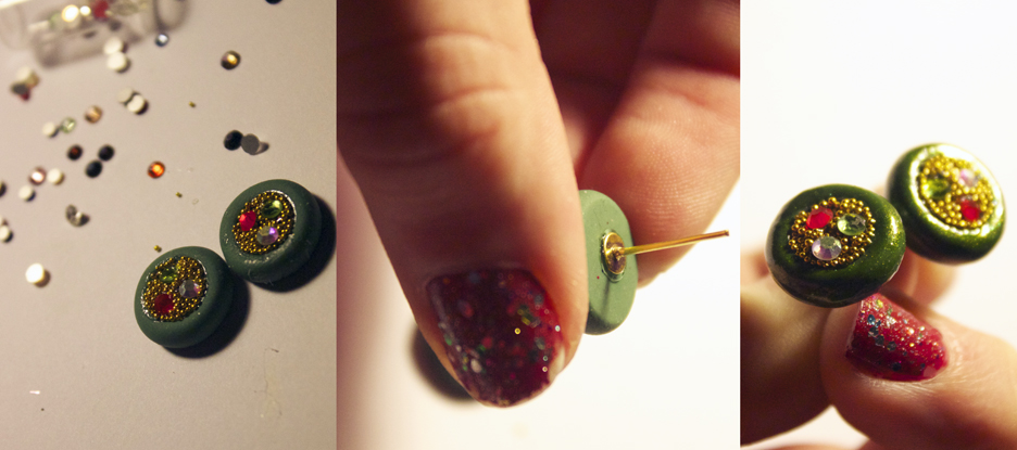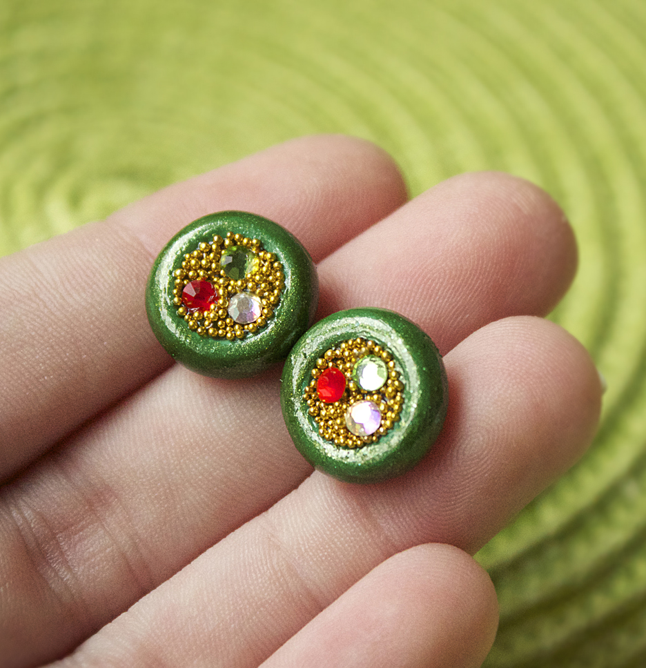 Now, paint the outside rim of the earrings and the backs with clear glaze (I here used a coat of sheer green glitter nail polish as well as clear glaze to give more sparkle. Feel free to do that with whatever color you have, just make sure the nail polish color is close to your base clay color for consistency.)