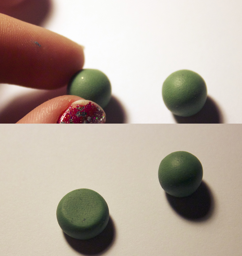 Step 2: Get your clay and make two small marbles. Flatten both marbles down so they have a flat front/back but still have some height, see picture above.