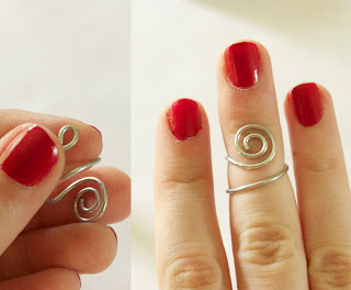 Step 2: Cut off a coil of wire. At one end, use your roundnose pliers and start a loop. Continue to make a loose loop, as seen in the picture. Now, bend this wire around your nail polish top, using it as a mold (find one that is the approximate size you need your ring. Remember, midi rings are smaller then regular rings). Continue looping until your wire is used up.