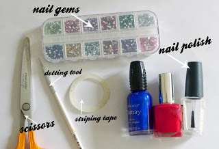 Step 1: Gather materials. Needed are scissors, a dotting tool or toothpick, striping tape (you can find at beauty supply stores or Ebay or Etsy), nail gems, and nail polish including top coat.