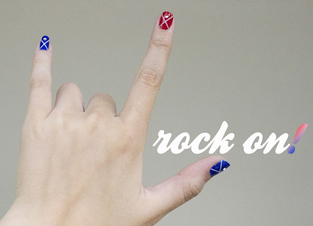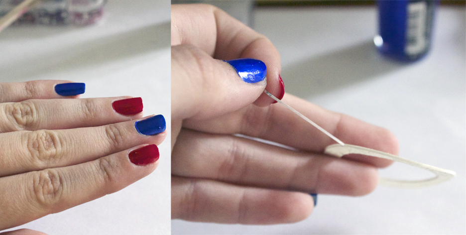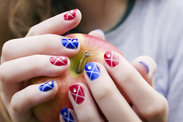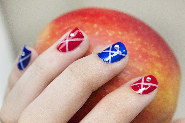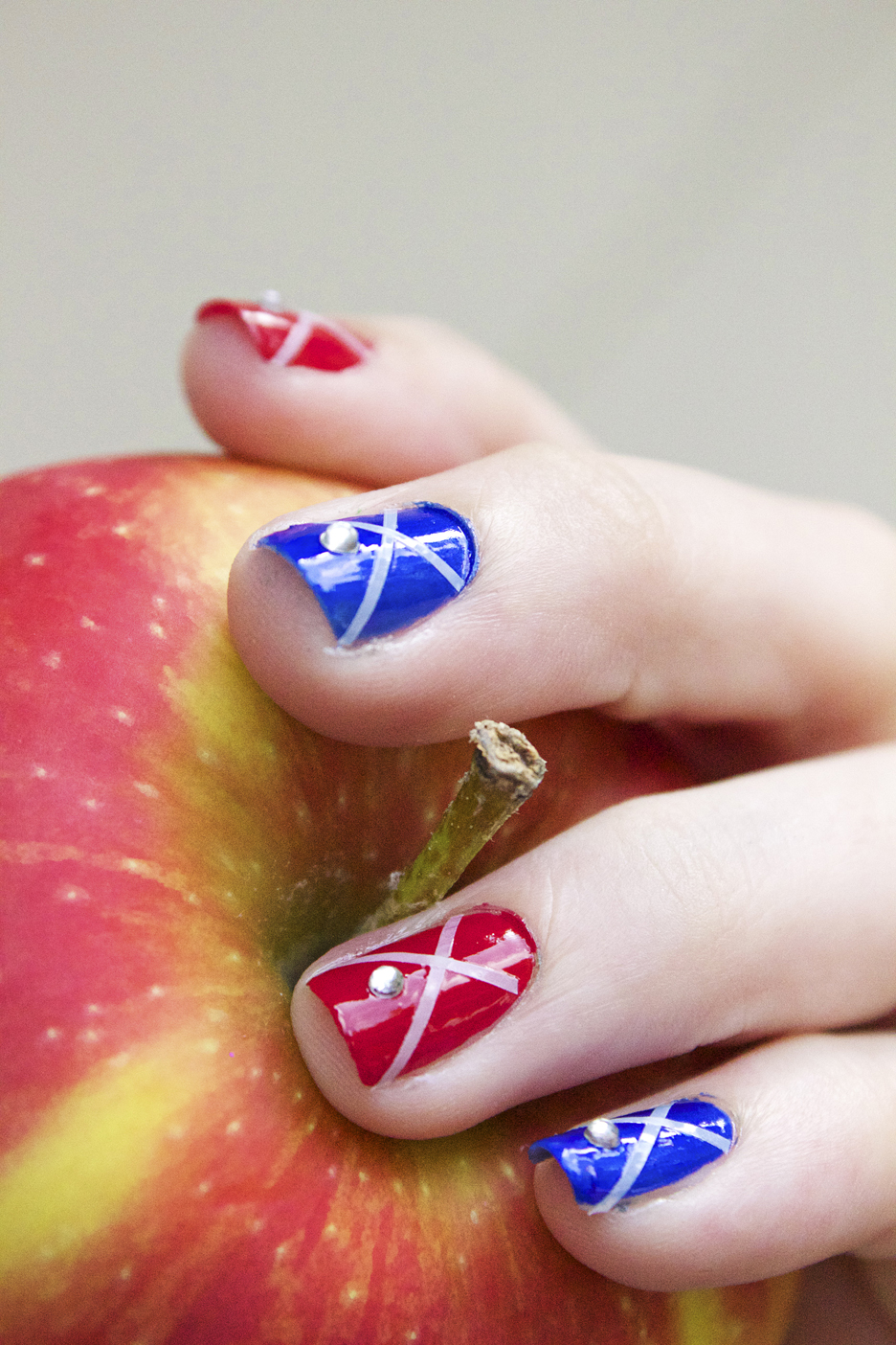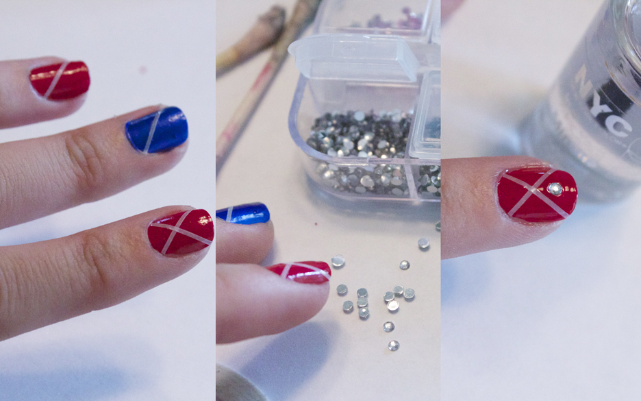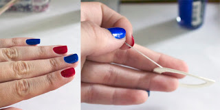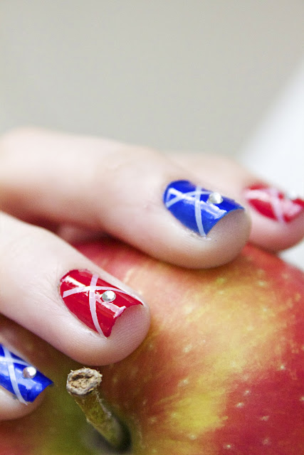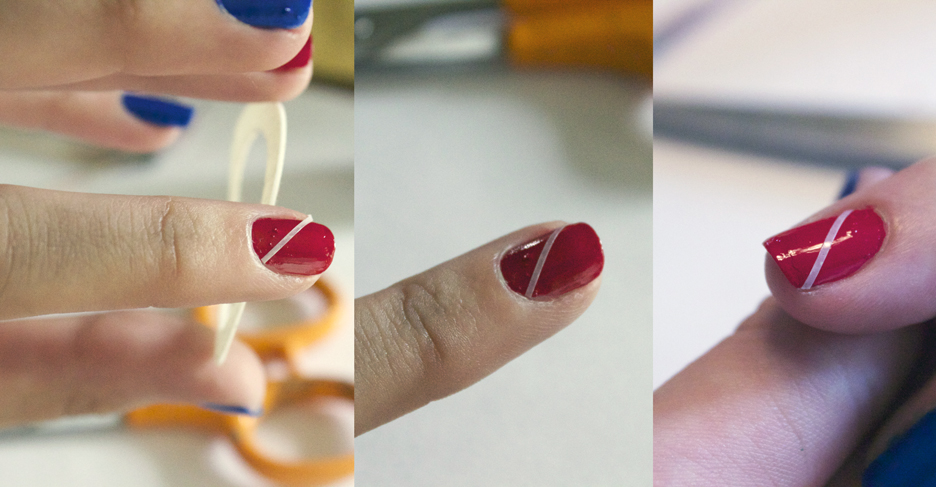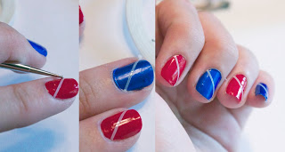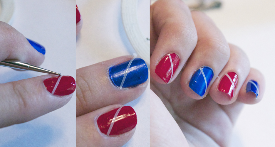 Step 2: Paint your nails blue and red, alternating. Get your white striping tape ready...