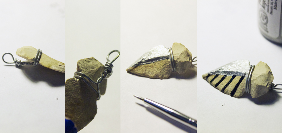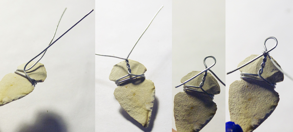 Step 2: Cut a piece of wire a couple inches long. Wrap a couple of times around the niche in the arrowhead, starting in the middle of the wire, and then bring the ends together in the back of the arrowhead. Twist the wires, and use one of the wires to make a loop (bring the excess wire down to meet the twist again), and use the other wire to wrap around the excess wire.