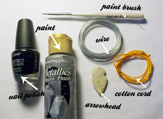 Step 1: Gather materials: needed is a paint brush, nail polish and/or acrylic paint, an arrowhead (small), cotton cording, and wire (the gauge doesn't matter so much, maybe 20 gauge or so). You will also need pliers and wire cutters. You may choose to use beads as well. I used metal beads of differing sizes; try maybe pearls or glass beads for a contrast! Maybe even add a crystal for sparkle....