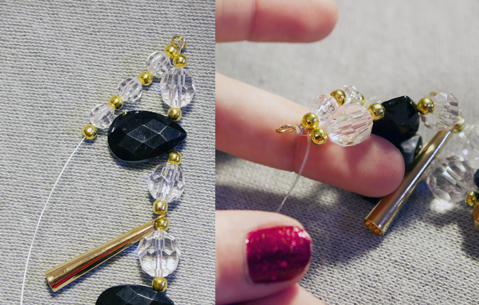 Step 3: After stringing on all the beads for the shorter strand, use the other empty fishing line to create your longer strand. I played around with my composition; most importantly, you want this strand to be longer, mine was 14".