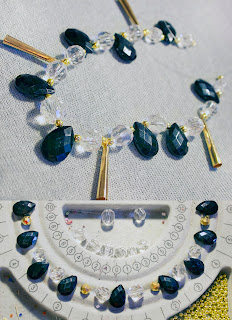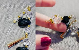 I started by adding two (NOT THREE as the pic shows, sorry) 6mm crystals alternating with the metal beads, then used my 10mm crystals and faceted metal beads here (view pic below to see what combo I ended with)