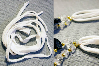 Step 6: Cut four long pieces of your tee shirt (I went around the stomach area, about in .5" wide strips), and thread two through each jump ring. To tie, simply gently knot the strips together!
