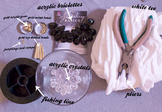 Step 1: Gather materials. Needed are pliers (here by Cousin), a plain white cotton tee shirt, 20mm acrylic briolettes (from Cousin), clear 6mm, 10mm and 15mm acrylic crystals (here by Cousin), 4mm metal beads, 10mm faceted gold beads, top drilled gold metal beads/charms (mine were 1.5" long, and hollow on the inside like tubes), jumprings and crimps, and fishing line (8 pound).