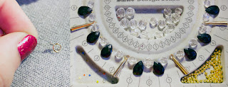 Step 2: Cut about a 4' long piece of fishing line and fold in half. Thread on a jumpring and crimp, and at the halfway mark secure on the jumpring by crimping the clasp. It helps to use a bead board to lay out the composition of your beads. This is going to be the shorter strand of beads, so that the strand will be about 12" long. I started out with the 10mm crystal, alternating with metal beads, the briolettes and the metal charms, adding a large 15mm crystal in the very center.