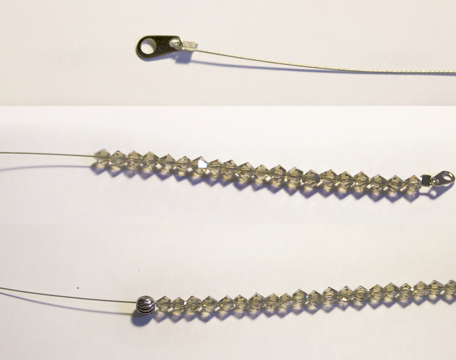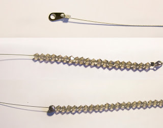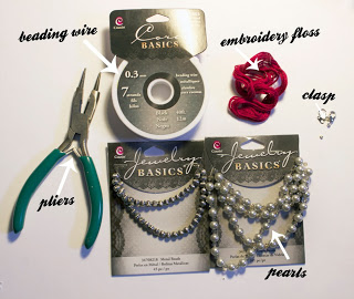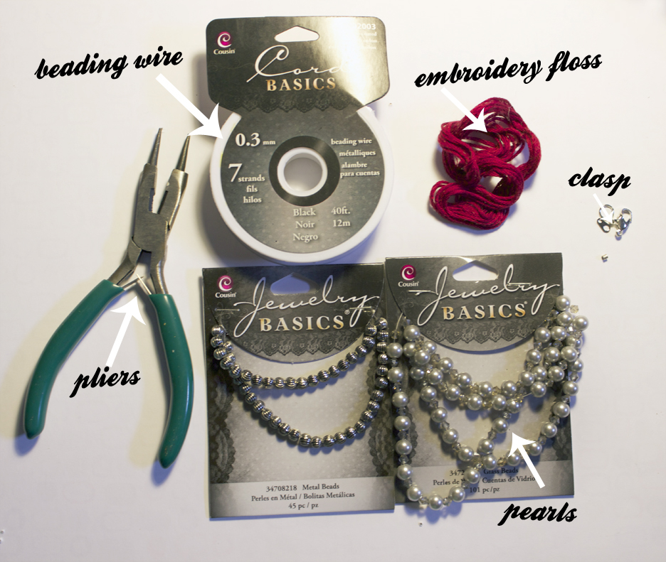 Step 1: Gather materials. Needed are pliers, beading wire (I used from Cousin), embroidery floss, a jumpring, two crimps, a clasp, and 4mm crystals (I used the grey crystals from Cousin's Jewelry Basics Pearl/Crystal Mix), and finally a 4mm metal decorative bead (I used Cousin's Fluted Silver beads).
